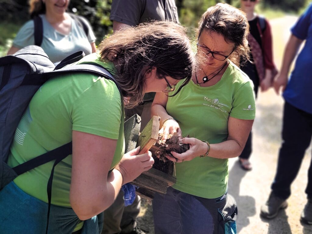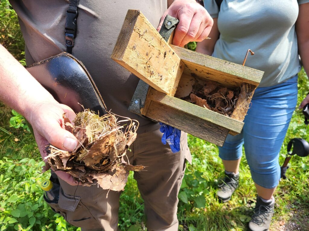 Nach einer Mittagspause ging es zu Fuß durch den Hartmannsdorfer Forst. Dort haben wir die Kästen für die Haselmaus kontrolliert. Im Fichtenunterwuchs wurden wir fündig und konnten ein Nest im Kasten begutachten. Beim Rundgang haben die Teilnehmer die verschiedenen Habitatstrukturen wahrgenommen. Gemeinsam konnten wir unsere Erfahrungen zum Monitoring austauschen und von den verschiedenen Herangehensweisen profitieren.